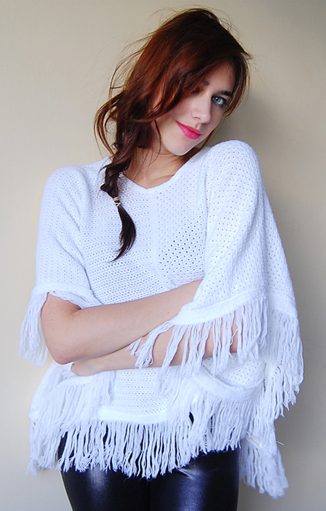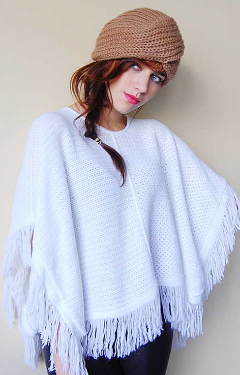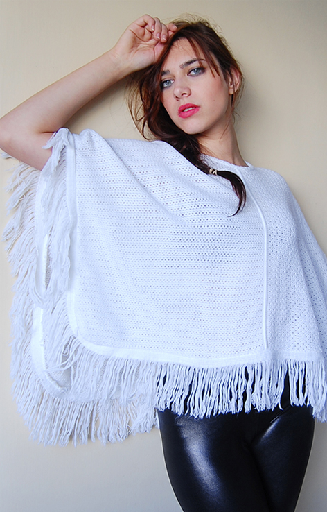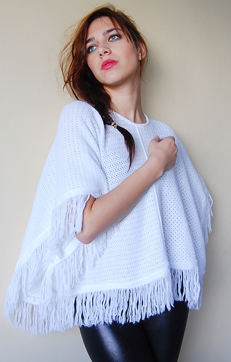 Białe dzianinowe ponczo z frędzlami